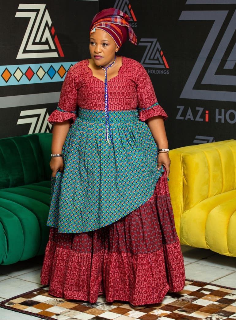 Embrace tradition with grace in our Zazi Isinxibo sikaMakoti Shweshwe Ensemble. This stunning outfit features a rich red Shweshwe-patterned top with elegant flared elbow-length sleeves, paired with a matching full-length tiered skirt. A striking overskirt in a contrasting teal and orange Shweshwe pattern creates the distinctive layered look essential for a ‘makoti’. Complete with a coordinating red Shweshwe iqhiya (headwrap), this ensemble is crafted for dignity and celebration. (Beadwork shown is for styling inspiration and may be available separately).